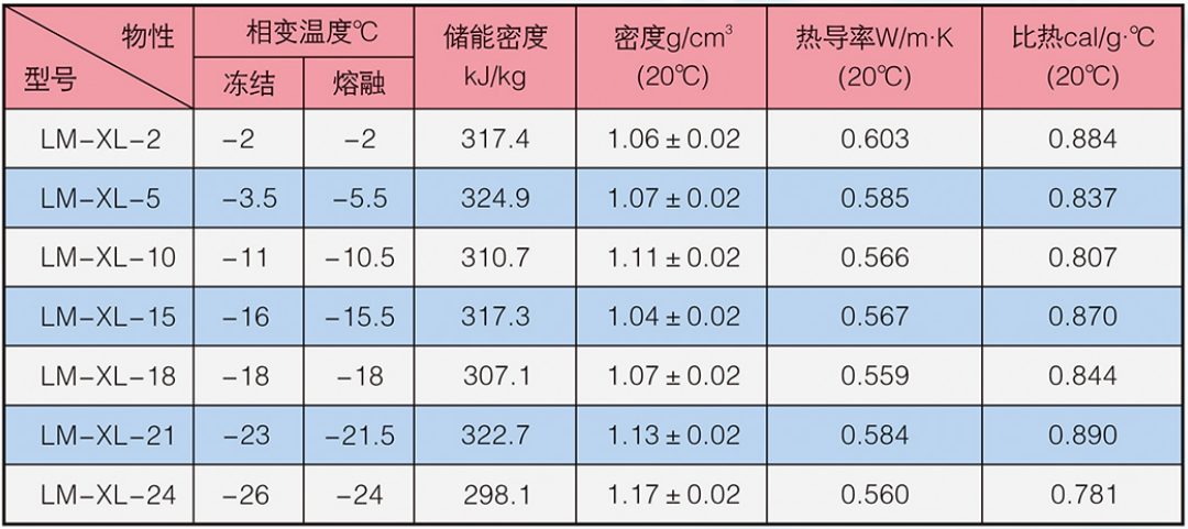 LM-XL系列產(chǎn)品由主儲(chǔ)能劑、相變調(diào)整劑、防過冷劑、防相分離劑、誘發(fā)劑等多組分復(fù)合制備而成。本品通過液-固-液相態(tài)變化實(shí)現(xiàn)冷能的儲(chǔ)存和釋放,具有較高的儲(chǔ)能密度及合適的比熱和導(dǎo)熱系數(shù)。本品不易揮發(fā)、安全可靠,可以反復(fù)使用。
